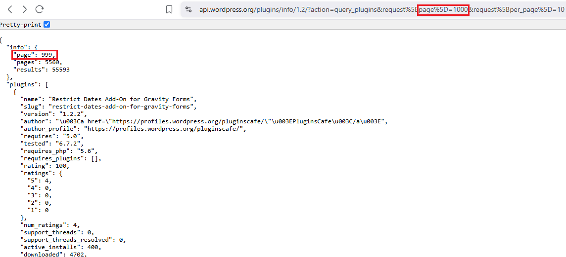 When submitting a request to api.wordpress.org with the page set to 1000, the returned response in the below image shows plugins from page 999. This also happens when the page is set to a value above 1000. Why does the request page value differ to the response?